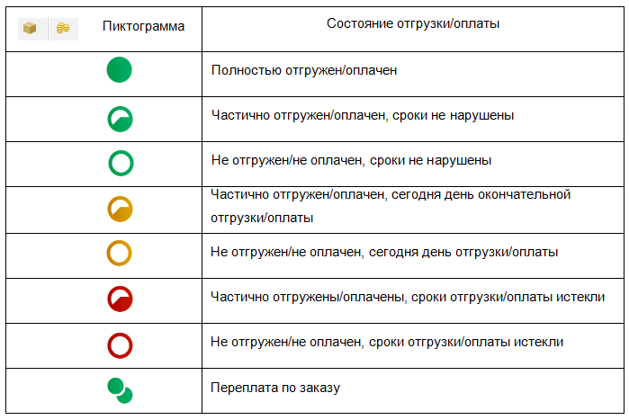 Состояние отгрузки и оплаты отображается круговыми пиктограммами и цветом: