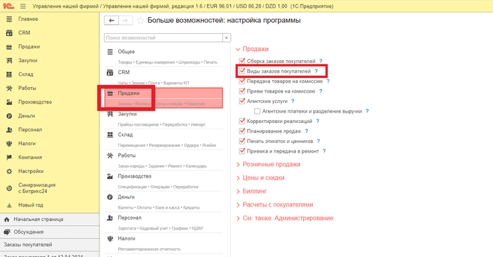 Раздел «Настройка» – «Ещё больше возможностей» – «Продажи» – «Виды заказов покупателей» (ставим галку).