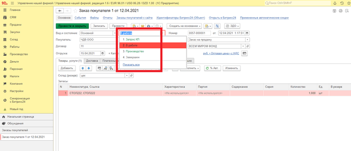 В форме заказа указывается состояние, которое определяет этап обработки заказа (в работе, производство, запрос КП, завершён). Список настраивается пользователем произвольным образом, как того требует бизнес.