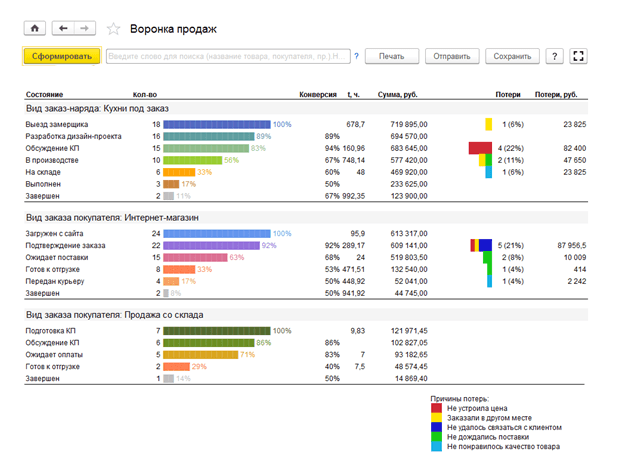 Значение состояния заказа влияет на проведение документа, определяет состояние сделки в воронке продаж (раздел «CRM» – подраздел «Аналитика» – «Воронка продаж»).