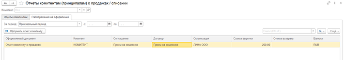 Для оформления и контроля отчётов комитентам в программе доступно рабочее место, которое будет заполняться, если проходила продажа или списание комиссионного товара: раздел «Закупки» ‒ «Комиссионные закупки» ‒ «Отчёты комитентам (принципалам)». На вкладке «Распоряжение на оформление» будет отображаться вся информация по продажам или списаниям, по которым ранее ещё не был сформирован отчёт комитенту (рис. 7).