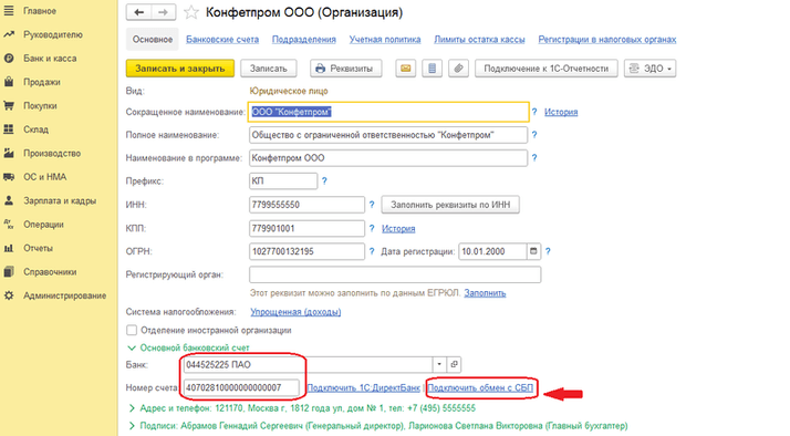 Настройка подключения в программе 1С происходит из карточки организации в разделе «Основной банковский счет» (необходимо указать актуальный банковский счет, для которого заключено соглашение на СБП), подпункт «Подключить обмен с СБП».