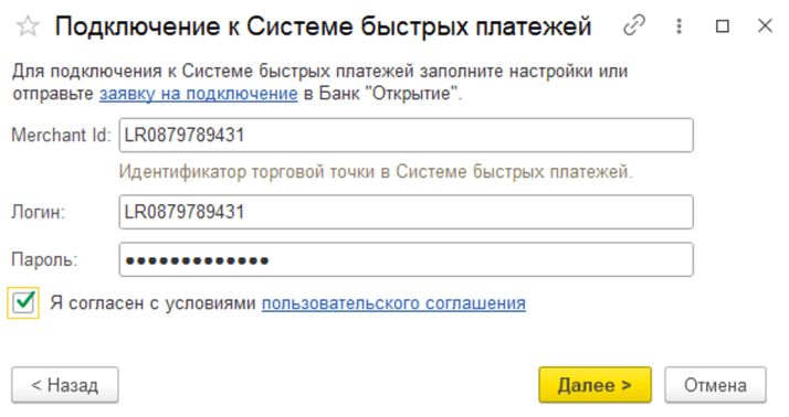 Далее необходимо направить заявку на подключение к системе, если она не была подана ранее, внести полученные в банке реквизиты (идентификатор торговой точки в СБП, а также присвоенные им логин и пароль).