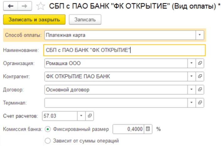 На следующем шаге необходимо настроить вид оплаты, а именно указать организацию, банк, в котором настраивается подключение к Системе быстрых платежей, счет расчетов и комиссию банку.