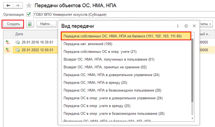 1.1. Для отражения передачи земельного участка в программе 1С:Бухгалтерия государственного учреждения ред. 2 применяется документ Передача объектов ОС, НМА, НПА из меню Основные средства, НМА, НПА (рис. 1).