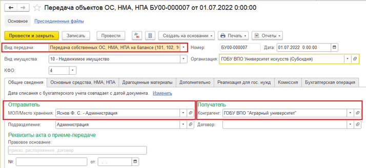 1.2. Для корректного формирования бухгалтерской записи в шапке документа выбирается Вид передачи: Передача собственных ОС, НМА, НПА на балансе (101.00, 102.00, 103.00); Вид имущества: 10 - Недвижимое имущество; КФО: 4 (рис. 3). На закладке Общие сведения указываются МОЛ/Место хранения, где учитывается передаваемый земельный участок, контрагент-получатель.