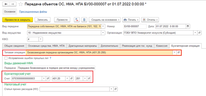 - Типовая операция: Безвозмездная передача организациям ОС, НМА, НПА (401.20.280);