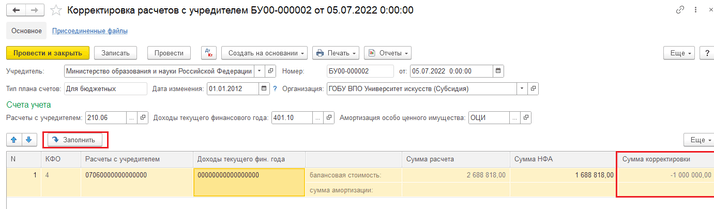 2.1. Корректировка расчетов с учредителем оформляется документом Корректировка расчетов с учредителем из меню Учет и отчетность (рис. 8).