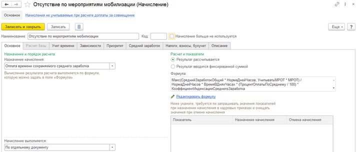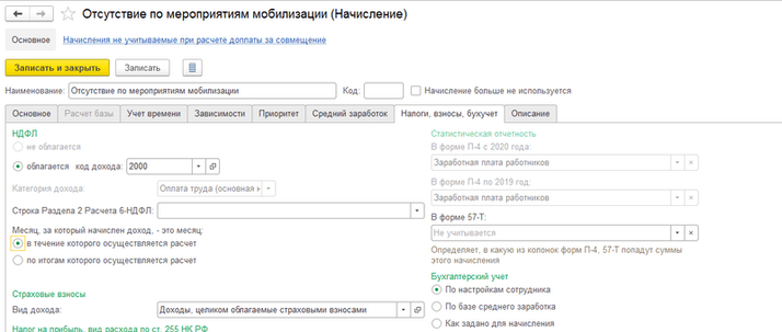 Для оплаты по среднему периодов прохождения медосмотров и оформления необходимых документов при мероприятиях мобилизации необходимо создать новое начисление.