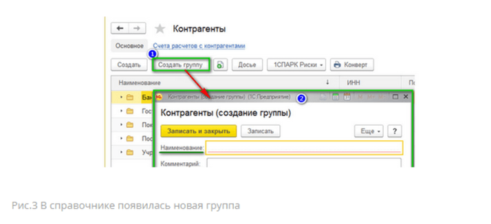 На входе в этот блок видим журнал, в котором находятся элементы справочника. Комфортную работу обеспечивает расположение контрагентов по индивидуальным папкам. При необходимости добавляем, выбираем действие «Создать группу», далее предлагается окно с наименованием «Контрагенты (добавление группы)», заполняем «Наименование», если есть потребность, вносим информацию в поле «Комментарий». Затем «Записать, закрыть».
