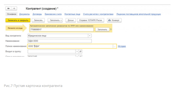 Автоматический способ реализован при наличии подключенного сервиса 1С:Контрагент. Если есть возможность такого занесения информации, преимущества очевидны: сведения вносятся после записи ИНН или названия компании программой, без допущения ошибок; есть возможность ознакомиться с подробным досье партнера; доступна проверка реквизитов ИФНС, а также отделений ФСС и ПФР. В случае, когда ИНН отмечен красным цветом, это значит, что контрагента нет в официальной базе ФНС.