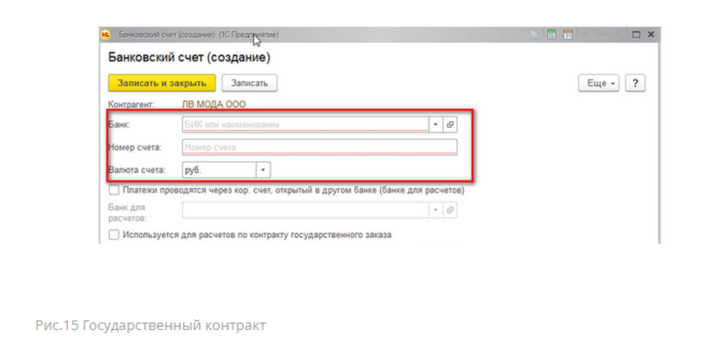 Для бухгалтерии важно, что в карточке удобно формировать данные по банковскому счету компании. Это действие выполняется по пути «Банковские счета» ‒ «Создать». Далее заполняются поля:
