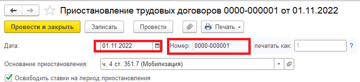 Рисунок 2. Как указать дату приостановления трудового договора и номер документа