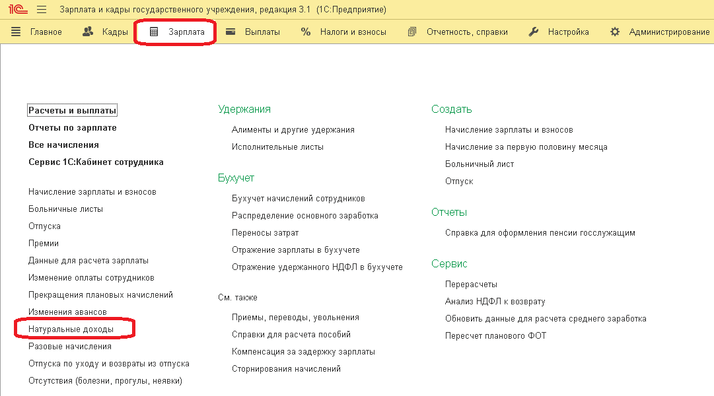 Чтобы отразить этот вид начисления в учете, нужно создать документ «Натуральные доходы» в разделе «Зарплата» (рис. 3).