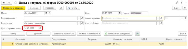 Так как суточные отражаются в виде натурального дохода, сумма начисленных сверхнормативных суточных не увеличивает сумму к выдаче по сотруднику. Поэтому из документа «Доходы в натуральной форме» нет возможности сформировать ведомость на выплату. Удержание НДФЛ с суммы суточных сверх нормы будет произведено при окончательной выплате заработной платы сотруднику.