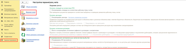 Возможность резервирования включите в настройках параметров учета в разделе «Администрирование». Вам понадобится закладка «Ведение учета». В ней установите флаг «Резервировать МЗ при выбытии» (рис. 1).