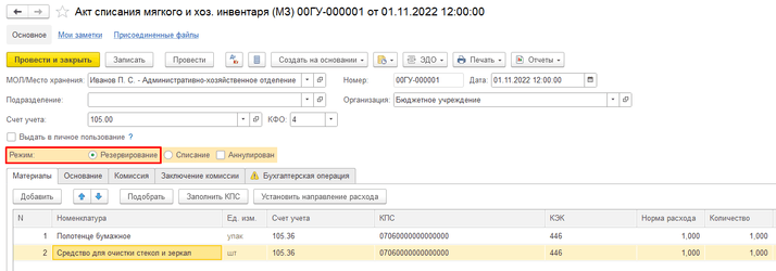 Если установили флаг «Резервировать МЗ при выбытии», будет резервироваться только количество списываемых материальных запасов (рис. 1). В документах отображается переключатель «Режим» (рис. 2).