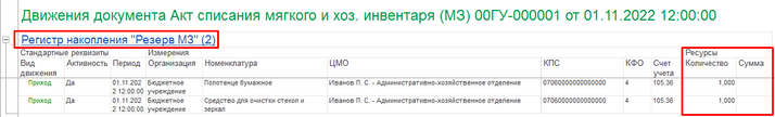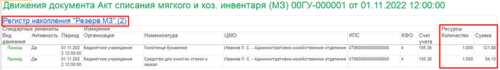 После согласования документа в режиме «Списание» будет списан ранее установленный резерв (по регистру «Резерв МЗ») и будут сформированы проводки документа в количестве и сумме, которые были зарезервированы ранее.