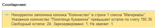 Контроль доступного количества при проведении документов учитывает зарезервированные материальные запасы и запрещает проведение, если количества недостаточно. В этом случае увидите сообщение о нехватке материальных запасов (рис. 4).
