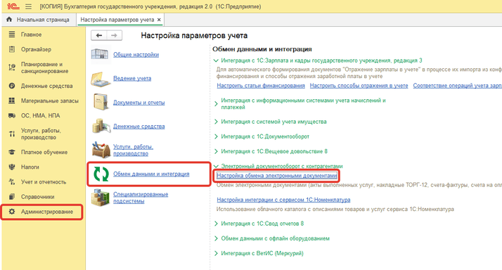 Для включения внутреннего электронного документооборота перейдите в раздел «Администрирование». В «Настройках параметров» учета нажмите «Обмен данными и интеграция», затем кликните «Настройка обмена электронными документами» (рис. 1).