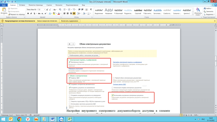 Включите флаги у полей «Электронные подписи», «Сервисы ЭДО» и «Использовать внутренние электронные документы» (рис. 2).
