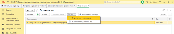 Настройки внутреннего электронного документооборота доступны в элементе справочника «Организации». Необходимо нажать на кнопку «ЭДО» и выбрать раздел «Настройки внутреннего ЭДО» (рис. 3).