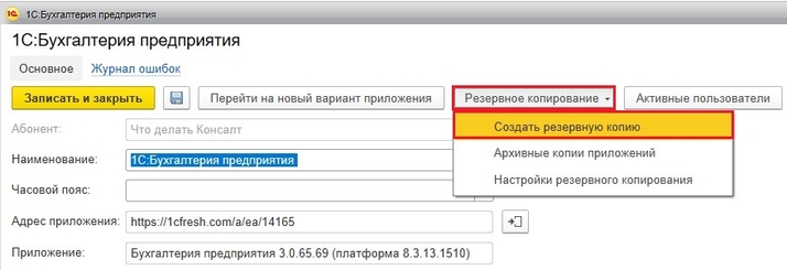 Для начала всем пользователям необходимо выйти из базы 1С. Следом зайти в личный кабинет под учетной записью с полными правами, выбрать нужную базу и по кнопке «Резервное копирование» запустить создание резервной копии.