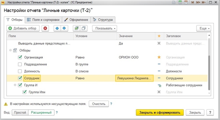 Переходим в раздел «Кадры» - «Кадровые отчеты» - «Личные карточки (Т-2)». Выбираем «Произвольная дата», указываем ее. Заходим в «Настройки» - «Расширенные», на вкладке «Отбор» ставим галочку «Сотрудник». В графе «Условие» выбираем «Равно», в графе «Значение» - нужного сотрудника. Можно сохранить данные настройки при закрытии отчета, присвоив ему новое наименование.