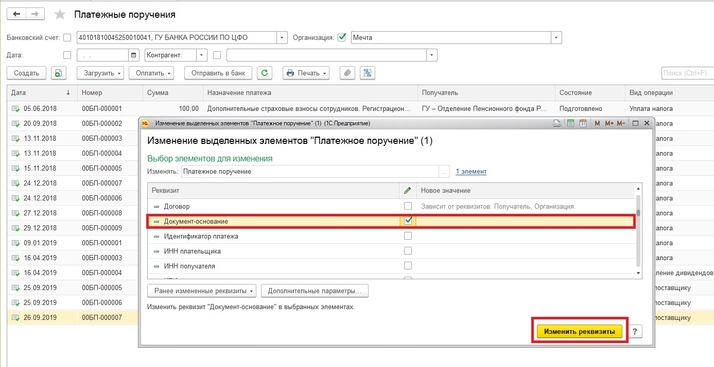 Для того, чтобы разорвать связь в документе «Списание с расчетного счета», нужно в самом документе по строке «Счет на оплату» очистить поле Счет, чтобы оно стало пустым. Чтобы "отвязать" счет поставщика от платежного поручения, нужно в списке платежных поручений выделить нужное, нажать правой кнопкой мыши «Изменить выделенные», установить флаг «Документ-основание», поле не заполнять – Изменить реквизиты. Счет уйдет из связки.