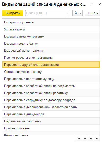 Для того, чтобы в документе «Списание с расчетного счета» появился новый вид операции «Перевод на другой счет организации», необходимо задать следующие настройки.