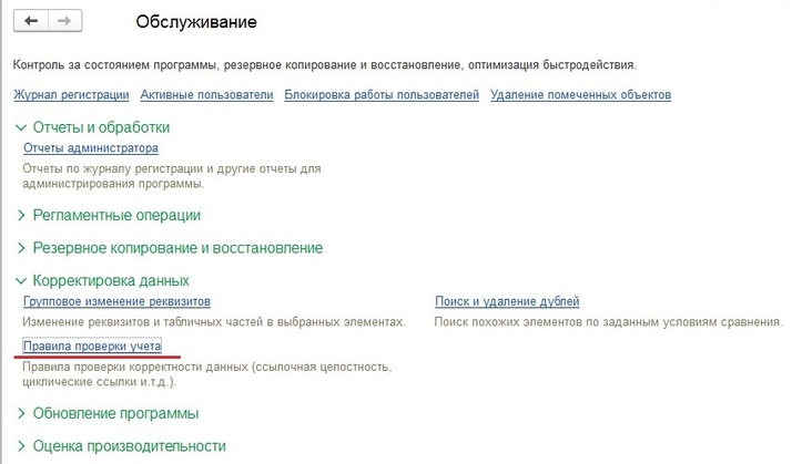 Чтобы выполнить вручную, необходимо перейти в раздел «Администрирование» – «Обслуживание» – «Корректировка данных» – «Правила проверки учета». Здесь выбираете необходимую Вам проверку, нажимаете на нее (чтобы строка стала желтой) и нажимаете кнопку «Выполнить проверку».
