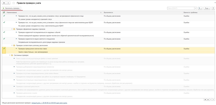 Нажимая на строку с ошибкой, либо на красный кружок, Вы переходите в окно с проверкой, которую необходимо выполнить. Выполняется данная проверка либо автоматически по расписанию, либо вручную.