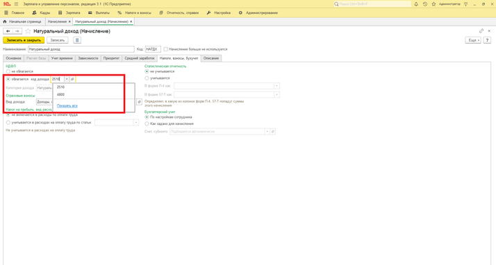Второй вариант. В разделе «Настройка» - «Начисления» выбрать вид начисления «Натуральный доход», на закладке «Налоги, взносы, бухучет» в поле «облагается код дохода» 2510 изменить код на 4800 «Иные доходы», либо изменить вид дохода в карточке с прочего дохода на оплату труда.