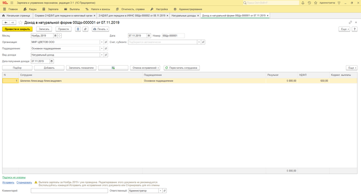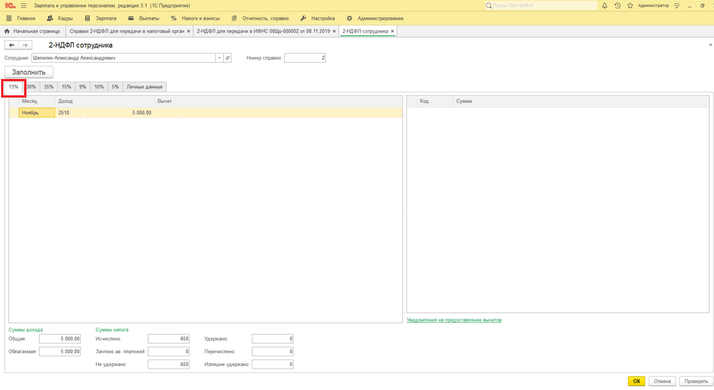 Таким образом, доходы сотрудника будут облагаться по ставке 13%. При формировании справки 2-НДФЛ доход в натуральной форме будет отражен на закладке 13%.
