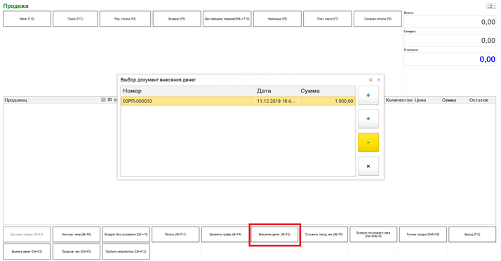 В 1С:Розница ред. 2.2. кассир оформляет внесение денежных средств в режиме работы РМК (раздел «Продажи» – «Сервис» – «РМК (управляемый режим)»).