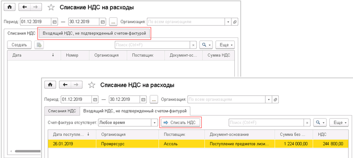 Для того, чтобы списать входящий НДС (не подтвержденный счетом-фактурой) на расходы, необходимо в разделе «Финансовый результат и контроллинг» – «НДС» –«Помощник по учету НДС» в разделе «Прочие операции» нажать ссылку «Нет списаний НДС на расходы» или «Списание НДС на расходы» (вид ссылки зависит от наличия документов списания в базе). Далее перейдите на закладку «Входящий НДС, не подтвержденный счетом-фактурой», выберите документ, по которому необходимо провести списание. Нажмите кнопку «Списать НДС». В открывшейся форме документа списания заполните поля на закладке «Основное». Проверьте и при необходимости отредактируйте данные на закладке «Ценности». В списке документов списания на закладке «Списания НДС» появится созданный документ.