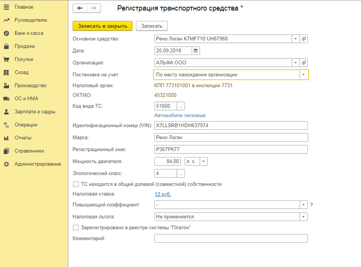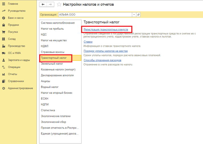 Сведения о транспортных средствах организации указываются в регистре сведений «Регистрация транспортных средств» в разделе «Главное» - «Налоги и отчеты» - «Транспортный налог».
