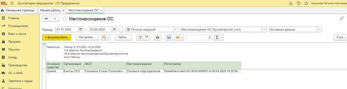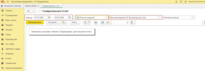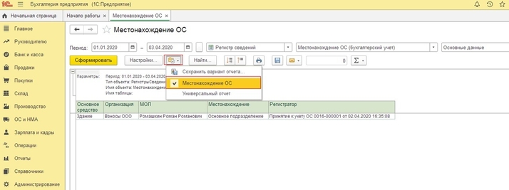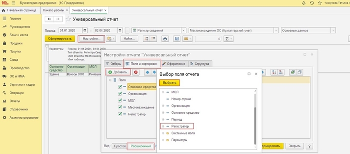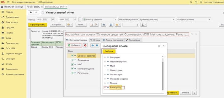 В верхней части универсального отчета находится командная панель. С помощью настроек панели нужно установить период. В поле “Тип данных” надо выбрать значение “Регистр сведений”, а в поле “Объект” из представленного списка объектов нужно выбрать регистр “Местонахождение ОС (Бухгалтерский учет)”. По кнопке «Настройки» можно установить выводимые в отчет поля. На вкладке «Поля и сортировки» добавляем поле «Регистратор» по кнопке «Добавить» и прописываем данное поле в структуру отчета на вкладке «Структура», проваливаясь в группируемое поле по кнопке «Добавить». После чего по кнопке «Закрыть и сформировать» формируем изменённый отчет. Также этот отчет мы можем сохранить по кнопке в виде папки - «Сохранить вариант отчета». Теперь при следующем открытии универсального отчета, отчет «Местонахождение ОС» будет доступен без предварительных настроек.