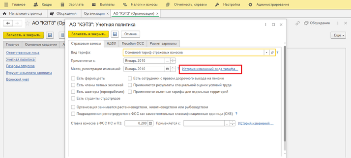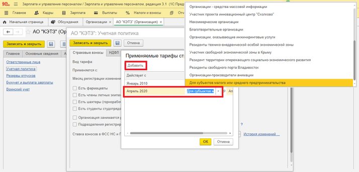 Для этого необходимо перейти в раздел Настройка – Организации – закладка Учетная политика и другие настройки – ссылка Учетная политика – Страховые взносы, через Историю изменения необходимо по кнопке Добавить установить месяц с которого будет применятся новый тариф и вид тарифа – Для субъектов малого и среднего предпринимательства.