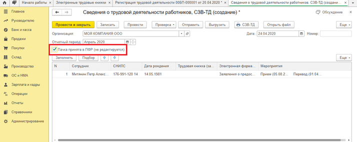 Для того чтобы отменить данные уже поданные в ПФР, необходимо перейти в исходный отчет СЗВ-ТД и проставить в нем галочку Пачка принята в ПФР.