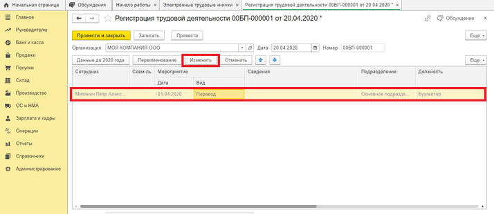 Далее необходимо создать новый документ Регистрация трудовой деятельности. В данном документе по кнопке Изменить, из списка в левом окне выбираете сотрудника(ов), в правом окне нажимаете на мероприятие, которое необходимо изменить. В документ Регистрация трудовой деятельности данное мероприятие встает двумя строками, отменяющей и активной. Активную необходимо удалить, а Отменяющую (серую) оставить. Далее – Записать и закрыть.