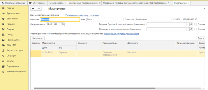После того как документ Регистрация трудовой деятельности записан, необходимо создать новый СЗВ-ТД. В созданном отчете подбором подтягиваете данного сотрудника(ов). Если посмотреть его(их) мероприятия там будет только строка отмены с датой отмены. Записать и закрыть – Сдать отчет.