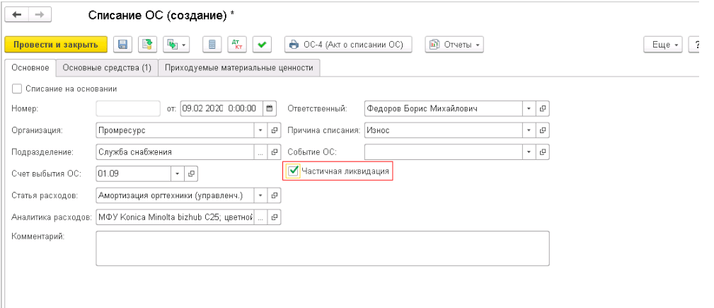Для того чтобы оформить частичную ликвидацию ОС, необходимо выполнить следующие действия: в разделе «Регламентированный учет» – «Основные средства» – «Документы по ОС». Нажмите кнопку «Создать» и выберите документ «Списание». Установите флажок «Частичная ликвидация». При частичной ликвидации выбывающая часть основного средства ничем не заменяется, но может быть использована в дальнейшей деятельности компании.