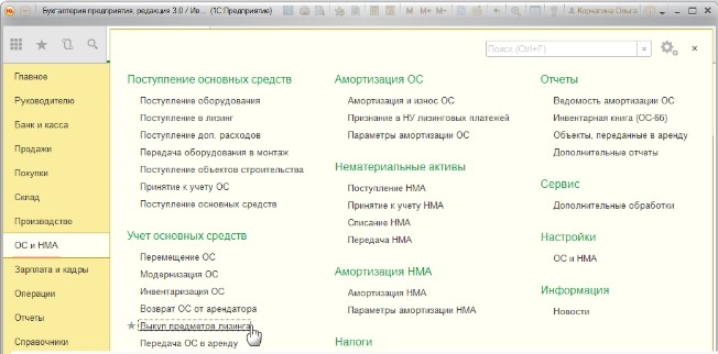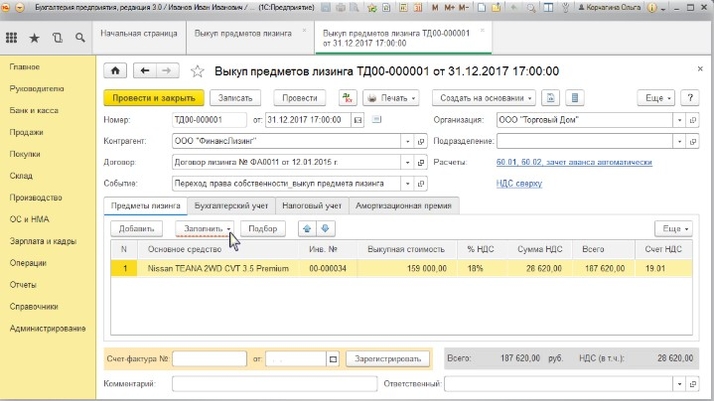 Для отражения в программе переходим, Меню: ОС и НМА - Учет основных средств - Выкуп предметов лизинга, кнопка "Создать". Нажмите на кнопку "Заполнить - Полученными в лизинг ОС". Табличная часть документа будет заполнена соответствующими объектами. Или нажмите кнопку "Добавить" и выберите из справочника "Основные средства" выкупаемый объект.