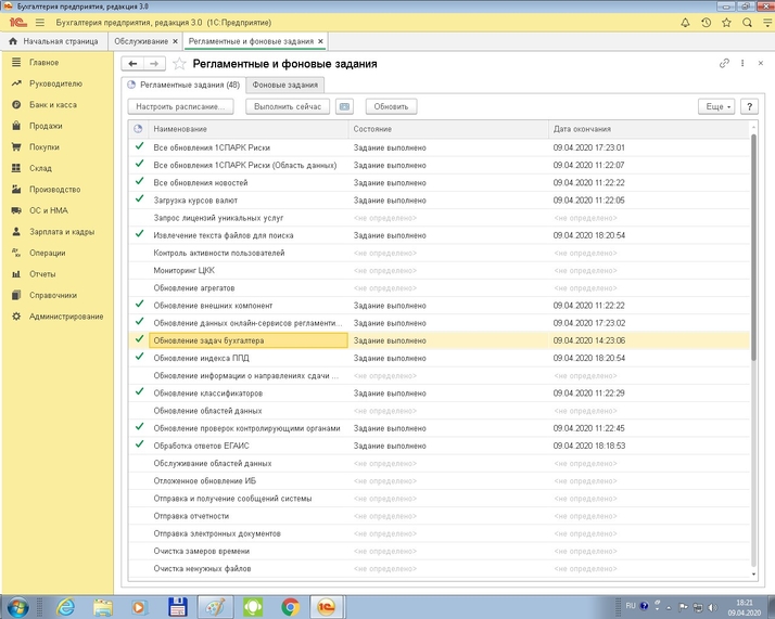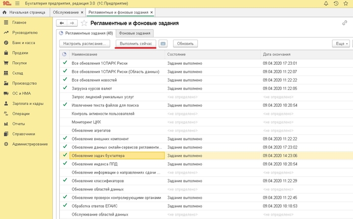 В программе 1С: Бухгалтерия предприятия ред.3.0, задачи бухгалтера обновляются автоматически если подключена интернет поддержка, но так же их можно обновить вручную. Для того чтобы это сделать, необходимо перейти в раздел «Администрирование» - «Обслуживание» - «Регламентные операции» - «Регламентные и фоновые задания» (рис.1). В открывшемся списке будет сформирован список заданий. Находите «Обновление задач бухгалтера» (рис.2) и нажимаете кнопку «Выполнить сейчас» (рис.3). После обновления необходимо будет перезайти в задачи на начальной странице.