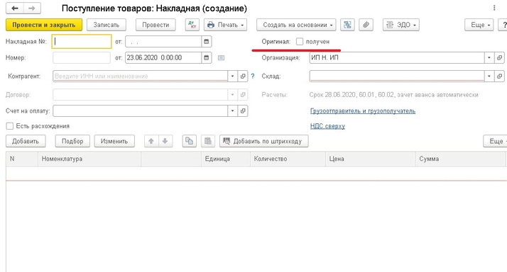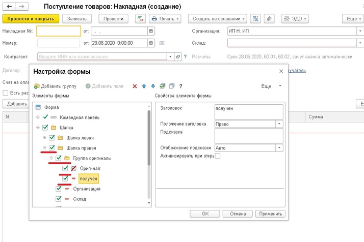 Чтобы вывести флажок «Оригинал получен», необходимо зайти в поступление (накладная) и в левом верхнем углу нажать на кнопку «Еще» - «Изменить форму…». Вам откроется окно Настройка формы, необходимо развернуть папку «Шапка», далее развернуть папку «Шапка правая», там вы увидите пункт «Оригинал получен», необходимо рядом в окошке поставить галочку, нажать кнопку ОК. После этого в документе Поступление появится строка «Оригинал получен».