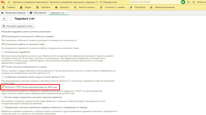 Для того чтобы в СТД-Р попадали все мероприятия до 2020 года из бумажной трудовой книжки по соответствующему работодателю в программе в 1С:Зарплата и управление персоналом ред. 3.1 в разделе «Настройка» - «Кадровый учет» установить галку «Заполнять СТД-Р всеми мероприятиями до 2020 года».