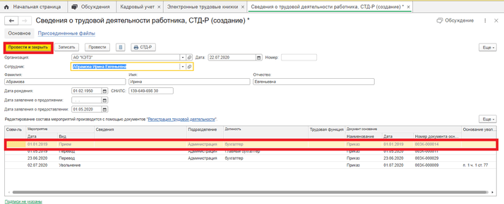 После выбора сотрудника в поле Сотрудники, табличная часть заполнится всеми кадровыми событиями данного сотрудника, в которых проставлена галочка Отразить в трудовой книжке, не переданные данные в ПФР в табличной части будут отмечены серым цветом.