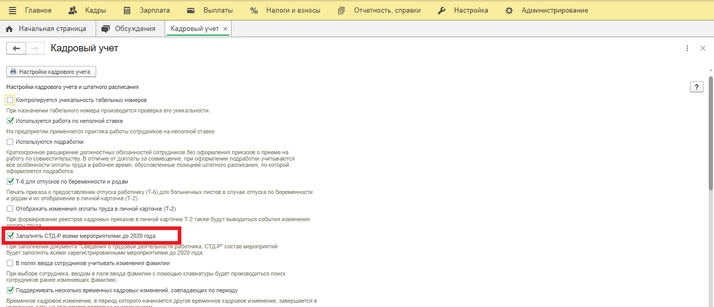 Для этого в настройках кадрового учета (раздел «Настройка» - «Кадровый учет») установите флажок «Заполнять СТД-Р всеми мероприятиями до 2020 года». При установленном флажке в форму попадут все зарегистрированные документом Регистрация трудовой деятельности либо непосредственно самими кадровыми документами (флажок Отразить в трудовой книжке должен быть установлен) мероприятия до 2020 года.