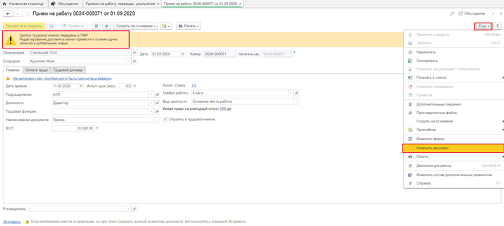 Внести корректировку в сведения можно непосредственно в кадровый документ, с помощью которого было зарегистрировано кадровое мероприятие, или с помощью документа Регистрация трудовой деятельности (раздел Кадры или раздел Отчетность, справки – журнал Электронные трудовые книжки).